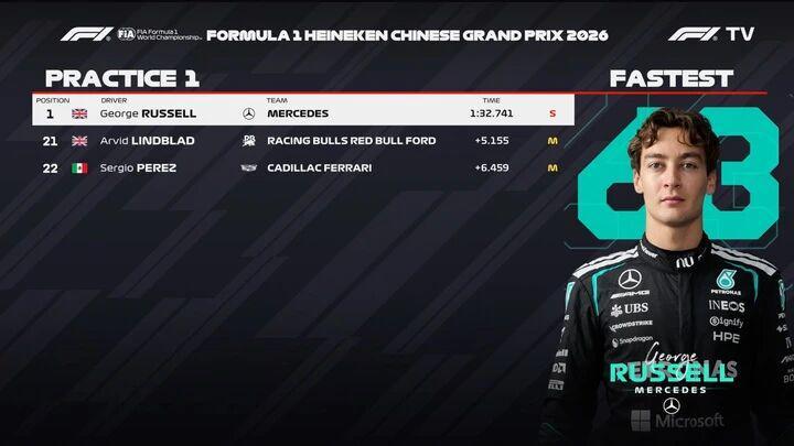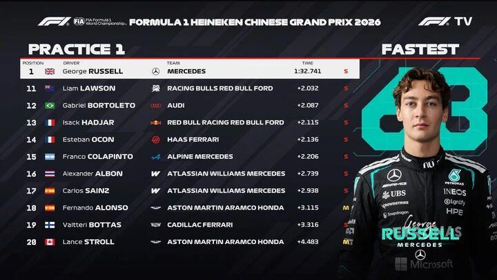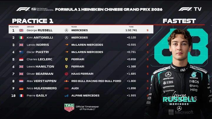 2026F1中国站今天中午结束了第一次练习赛,在澳大利亚站表现惊艳的梅奔双雄延续强势表现,拉塞尔以1分32秒741轻松跑出全场最快,队友安东内利以0.120秒的差距紧随其后,诺里斯排名第三。第四到第十依次是皮亚斯特里、勒克莱尔、汉密尔顿、比尔曼、维斯塔潘、霍肯博格以及加斯利。